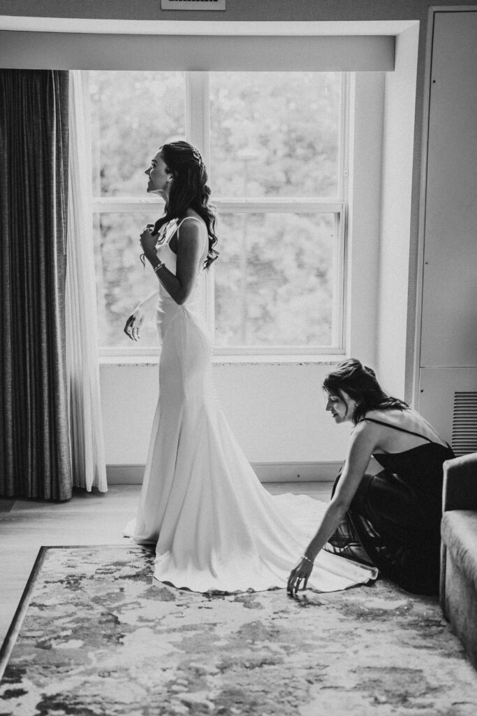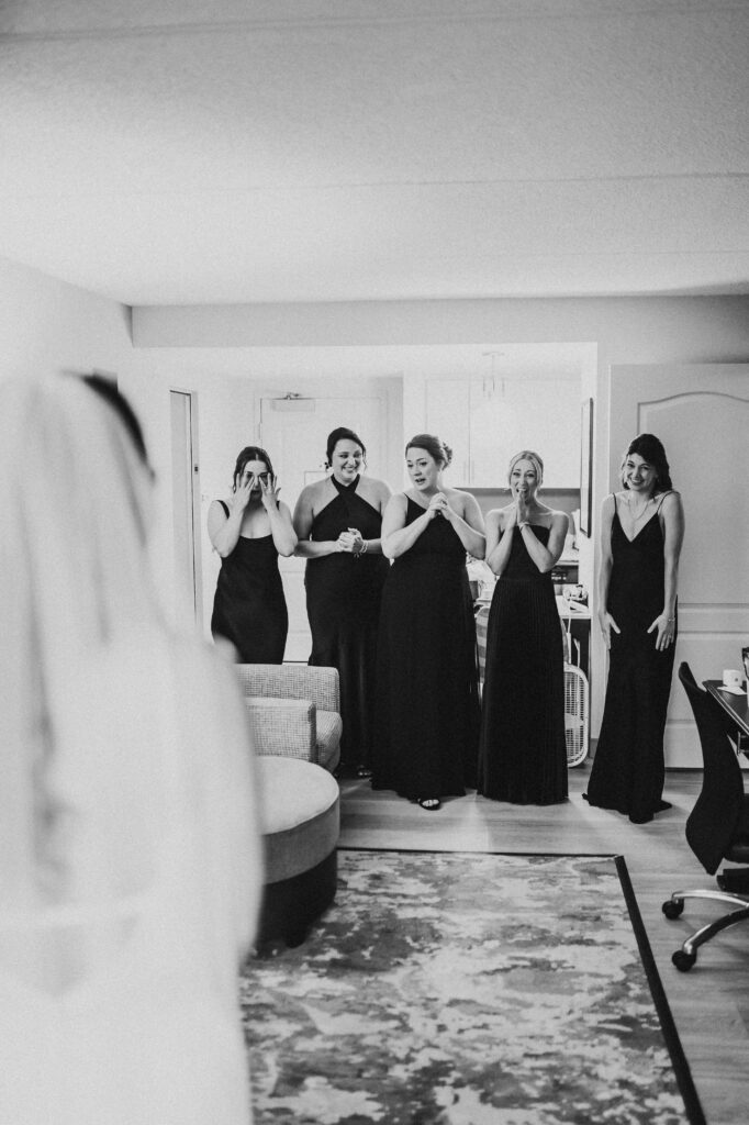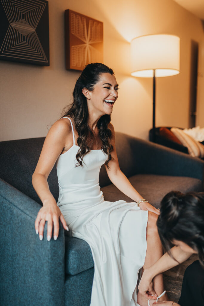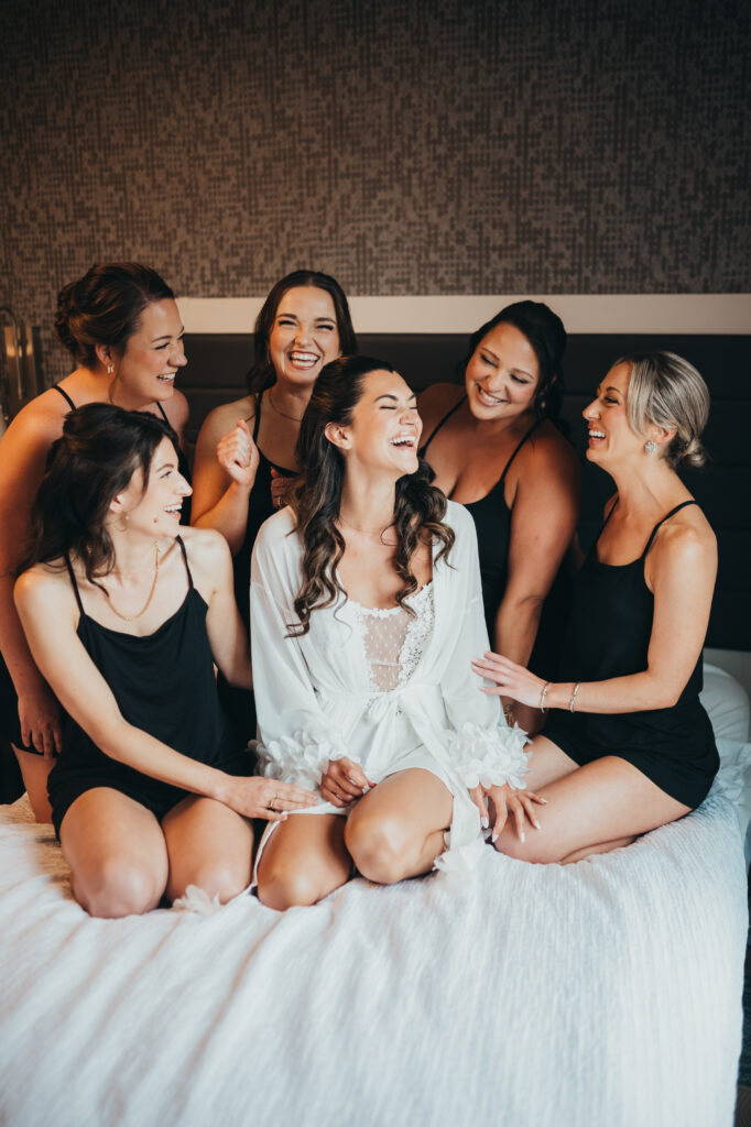 The day began quietly, with rain tapping softly against the hotel windows while the energy inside stayed light and joyful. Anna laughed with her closest friends on the bed in matching black pajamas as they got ready, and then she slipped into her gown.