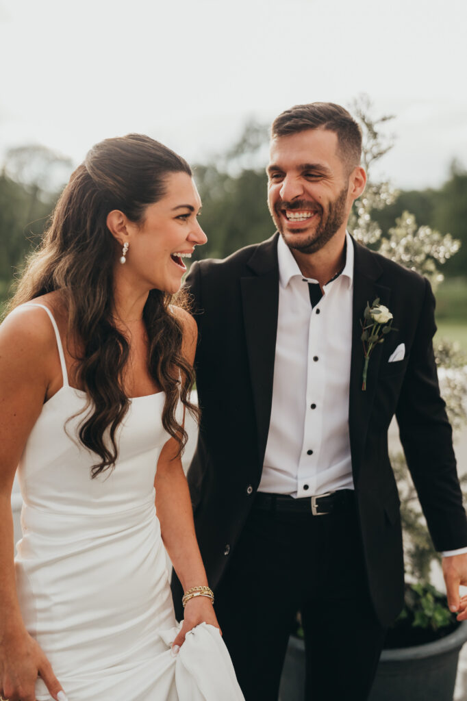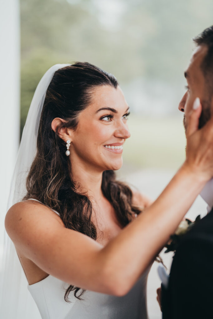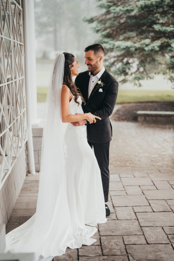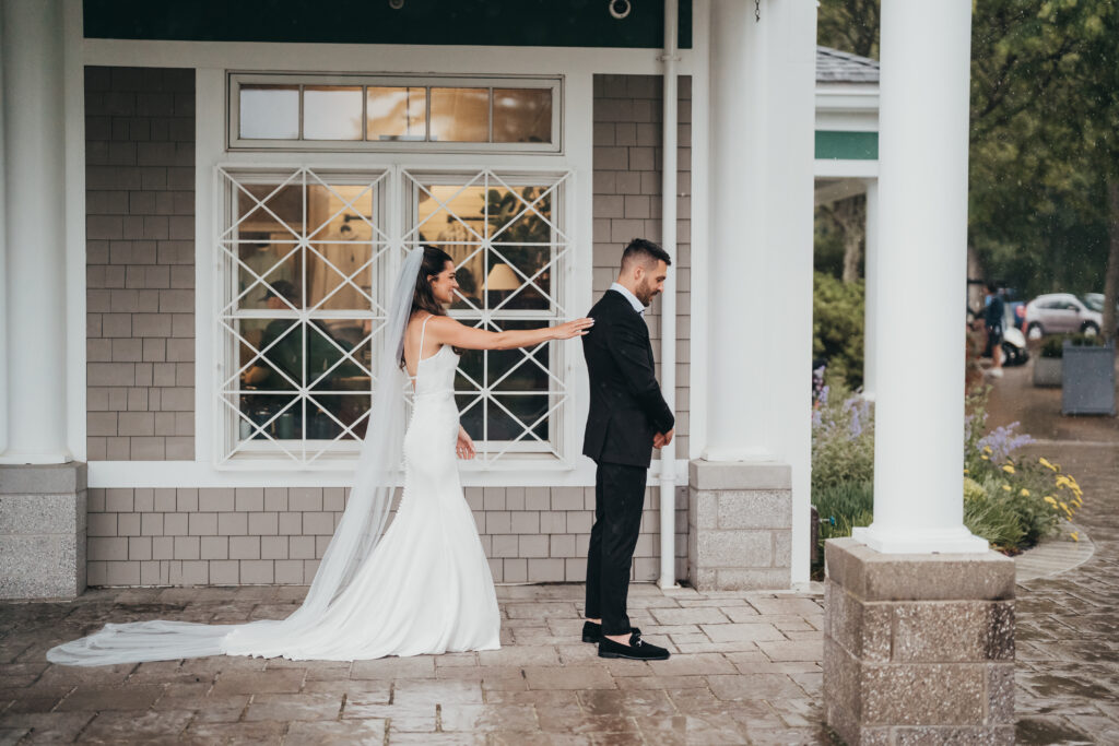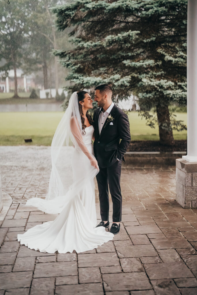 With the rain only coming down harder, Anna and Kevin went ahead with their first look under the covered patio at Brookmeadow. When we talked through the plan, they were completely on board and said the words every photographer loves to hear: “we trust you completely.” Raindrops fell softly around them as they stood close, surrounded by muted greens and evergreens that made the moment feel quiet and intentional.
