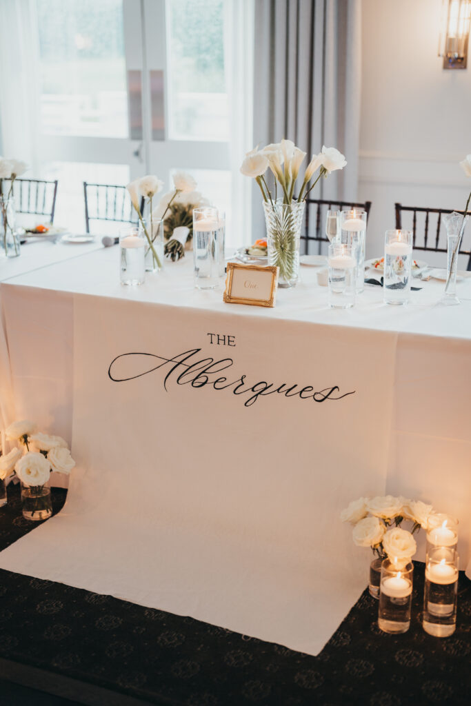 Inside the reception, the energy shifted from calm to full-on celebration. The room was styled in that clean, modern way that never tries too hard—white linens, simple glass vases with white florals, and floating candles adding just enough glow without stealing the spotlight.