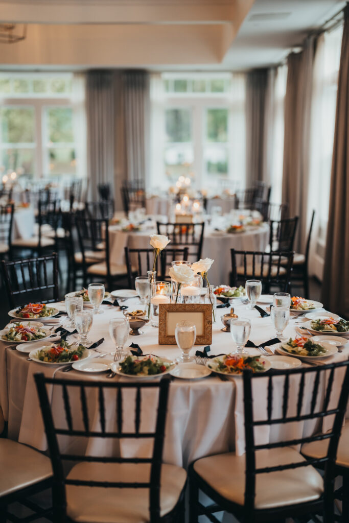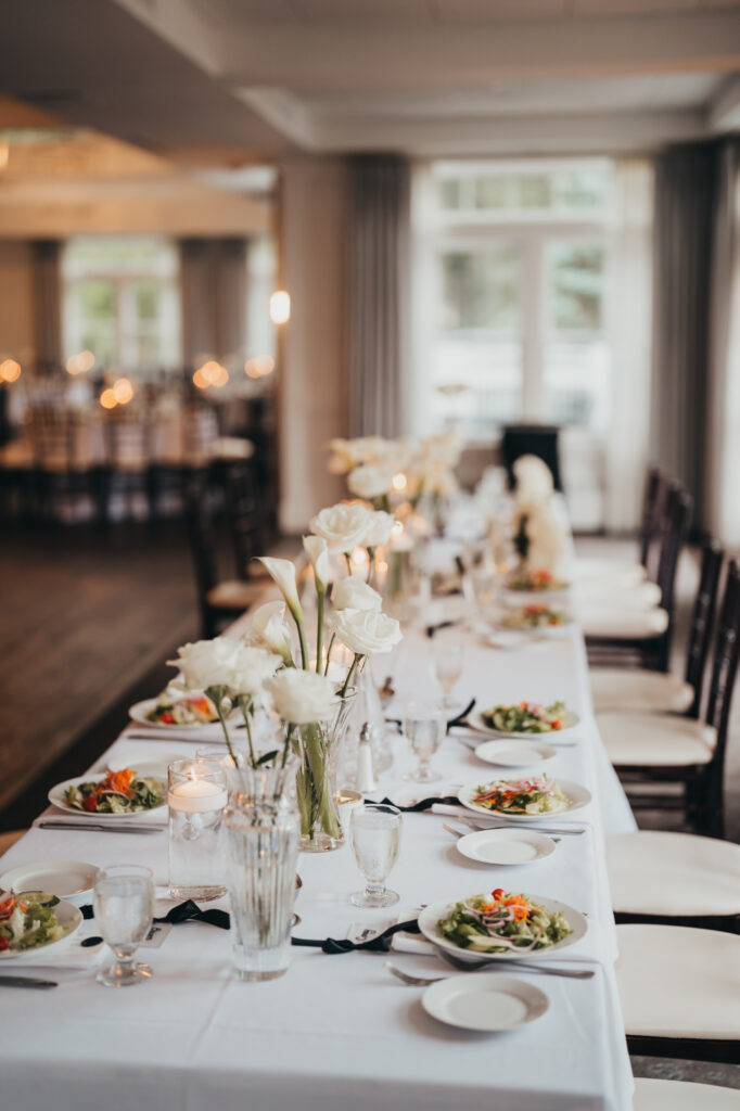 Dinner tables were set before guests walked in, salads already plated and waiting. The neutral palette worked perfectly with Brookmeadow’s clean aesthetic and those big windows that keep the space feeling open instead of formal.