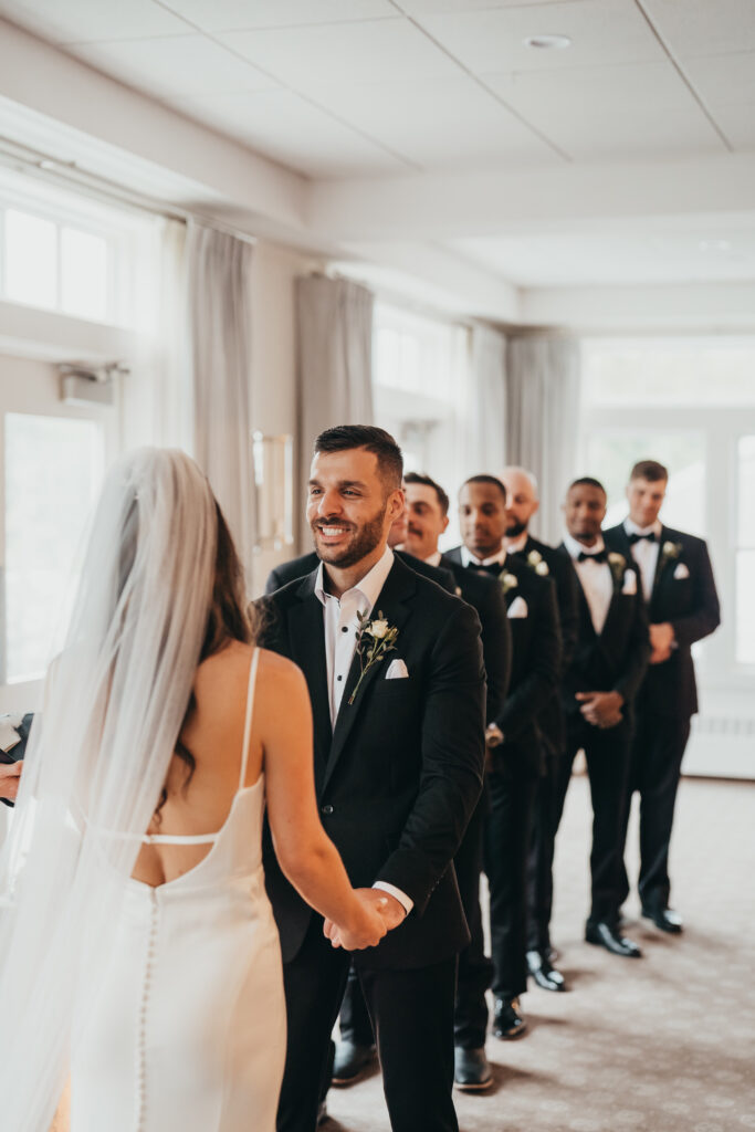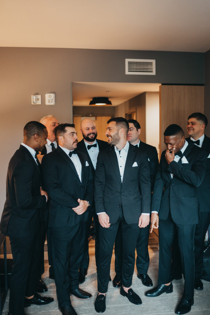 Kevin dressed in a classic black tux from State and Liberty Co., surrounded by his groomsmen – sharp, modern, and perfectly understated.